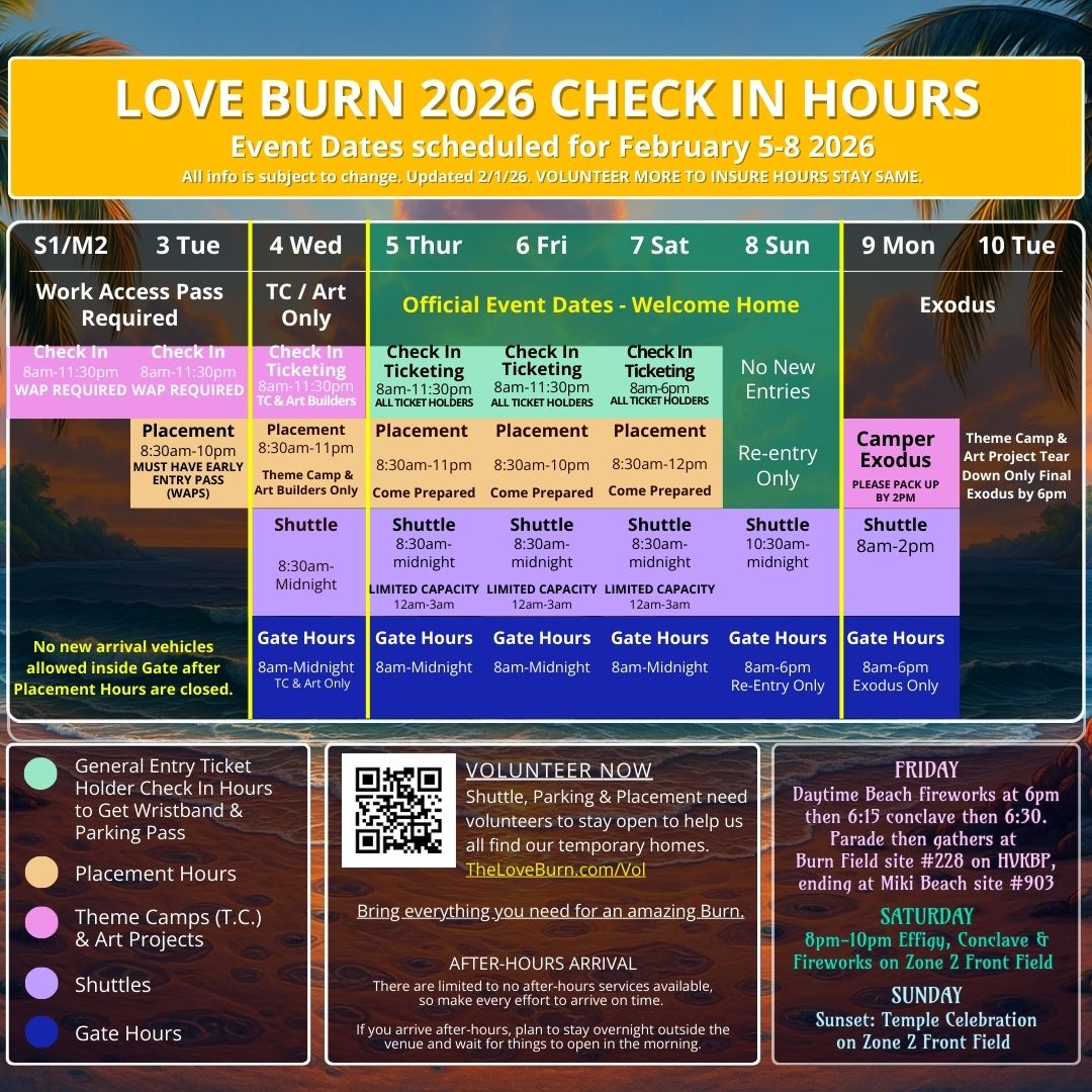 Tuesday, February 14: Artist Builders Only can arrive 8am to midnight with Placement open until 6pm.